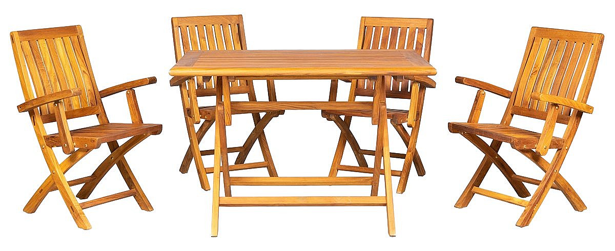 Sestava obsahuje: 1x Teakový skladací stôl VASCO, 4x Skladacie teakové kreslo DORIS