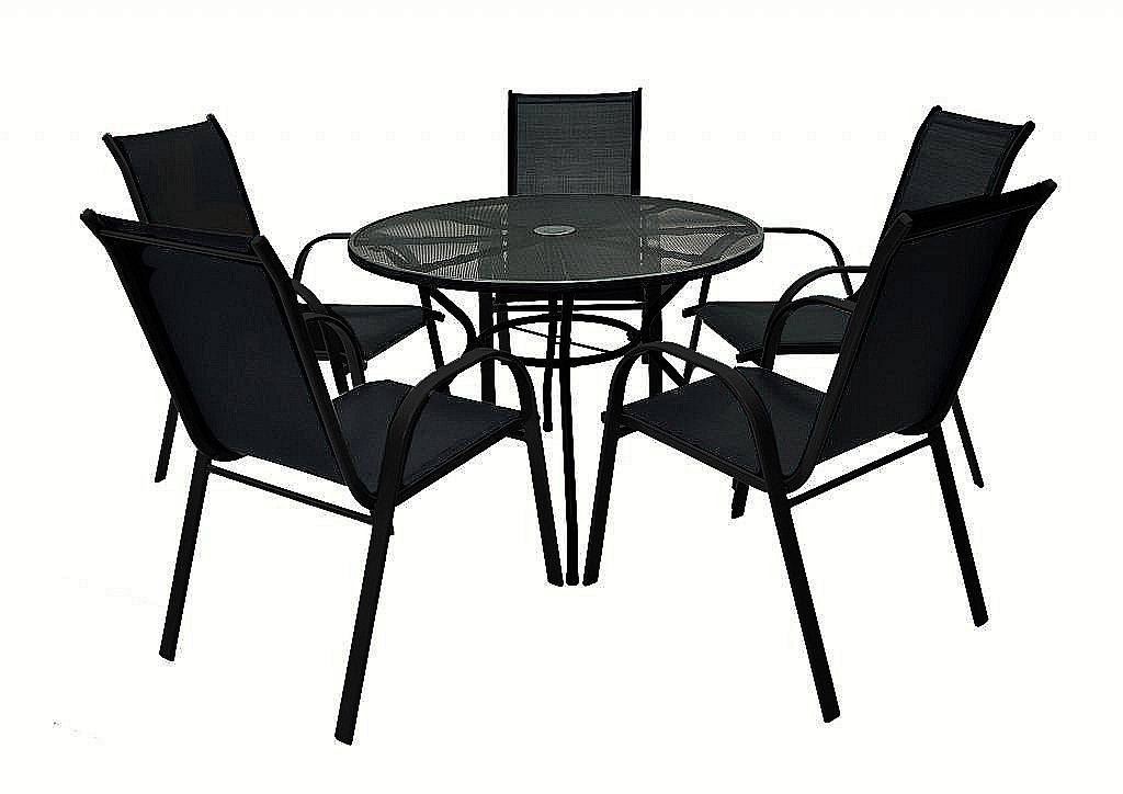 Sestava obsahuje: 1x Kovový stôl TAMPA ø 106 cm (čierna), 4x Záhradné kreslo GLORIA (čierna)