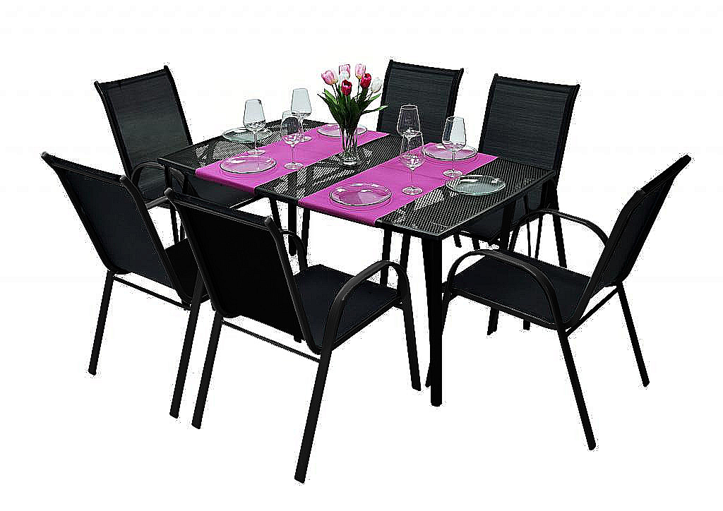 Sestava obsahuje: 1x Kovový stôl ASTOR (150 x 90 cm), 6x Záhradné kreslo GLORIA (čierna)