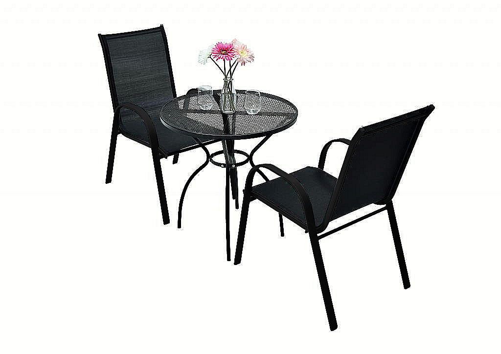Sestava obsahuje: 2x Záhradné kreslo GLORIA (čierna), 1x Kovový stôl STEEL (ø70 cm)