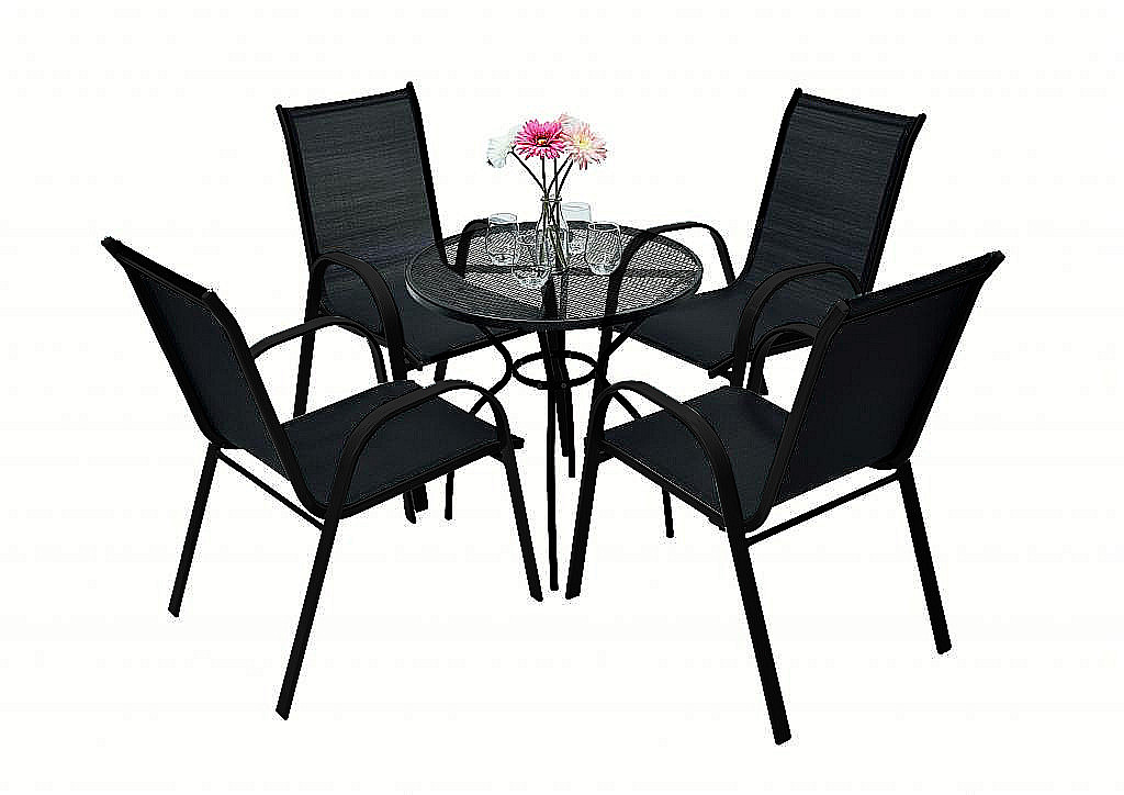 Sestava obsahuje: 4x Záhradné kreslo GLORIA (čierna), 1x Kovový stôl STEEL (ø70 cm)