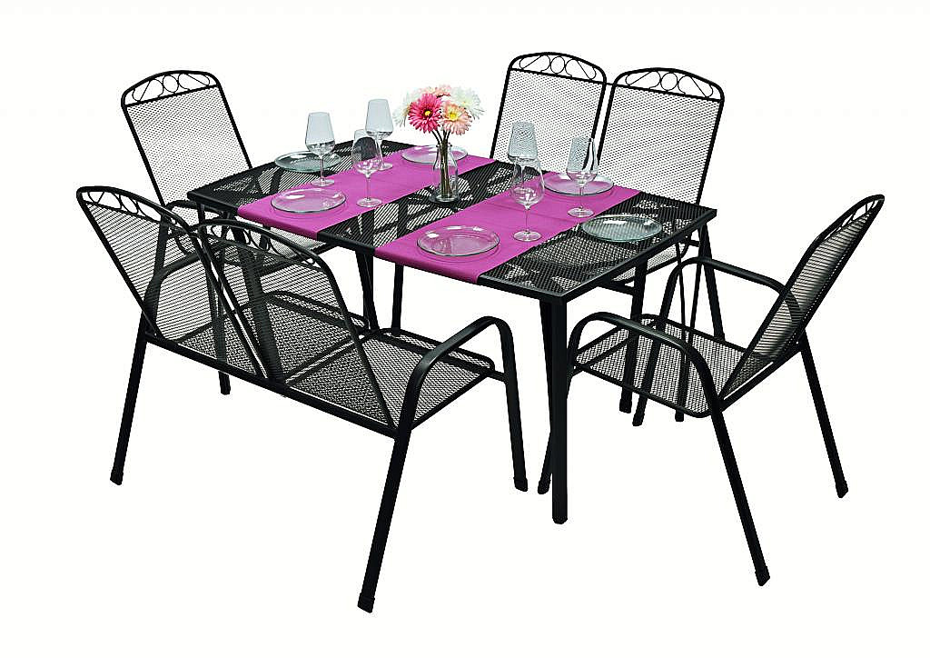 Sestava obsahuje: 2x Kovová lavice GREY (čierna), 2x Kovové kreslo GREY (čierna), 1x Kovový stôl ASTOR (150 x 90 cm)