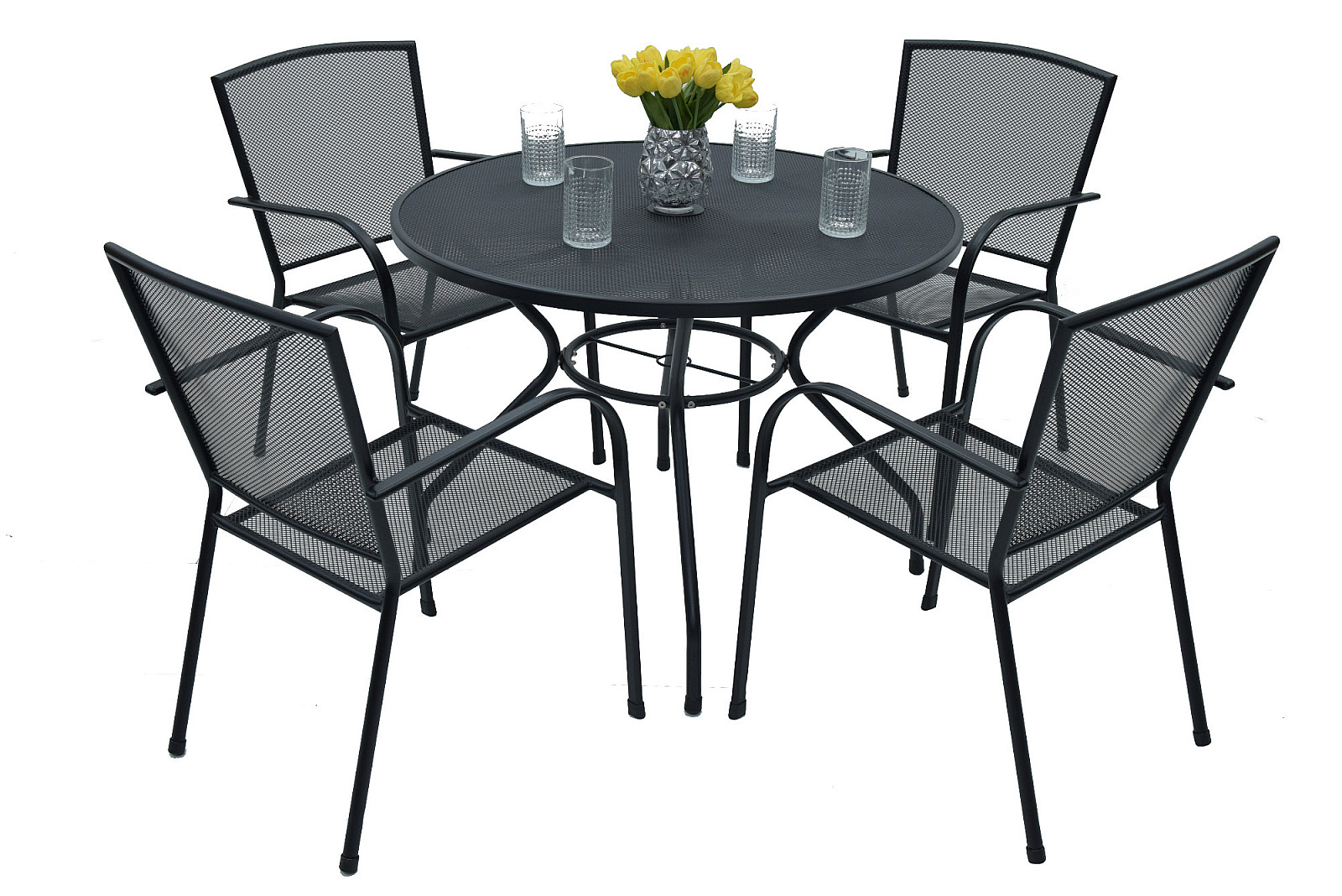 Sestava obsahuje: 1x Kovový stôl TAMPA ø 106 cm (čierna), 4x Kovová stolička MAYA (čierna)