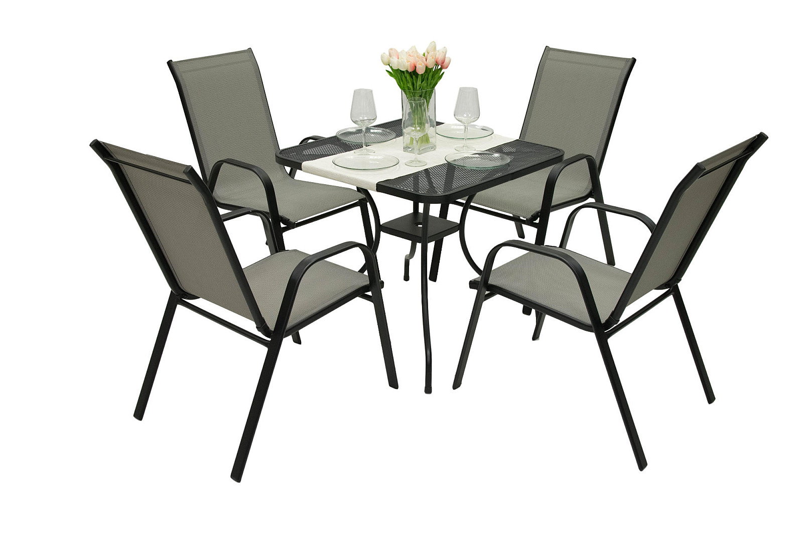 Sestava obsahuje: 1x Kovový stôl MONTREAL 80×80 cm, 4x Záhradné kreslo GLORIA (sivá)