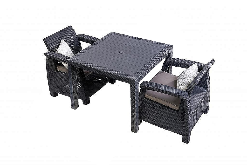 Stôl kombinácia tvrdý plast a umelý ratan. Sestava obsahuje: 1x Záhradný stôl z umelého ratanu MANHATTAN 95×95 cm (antracit), 1x Záhradná ratanová zostava CORFU DUO (antracit)