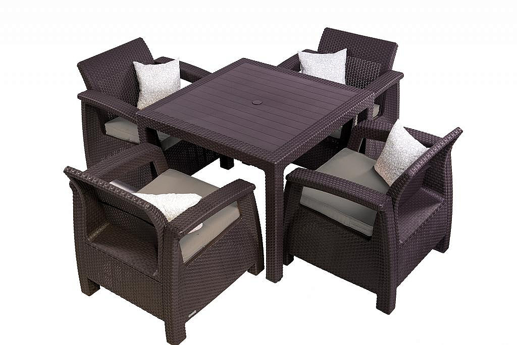 Stôl kombinácia tvrdý plast a umelý ratan. Sestava obsahuje: 1x Záhradný stôl z umelého ratanu MANHATTAN 95×95 cm (hnedá), 2x Záhradná ratanová zostava CORFU DUO (hnedá)