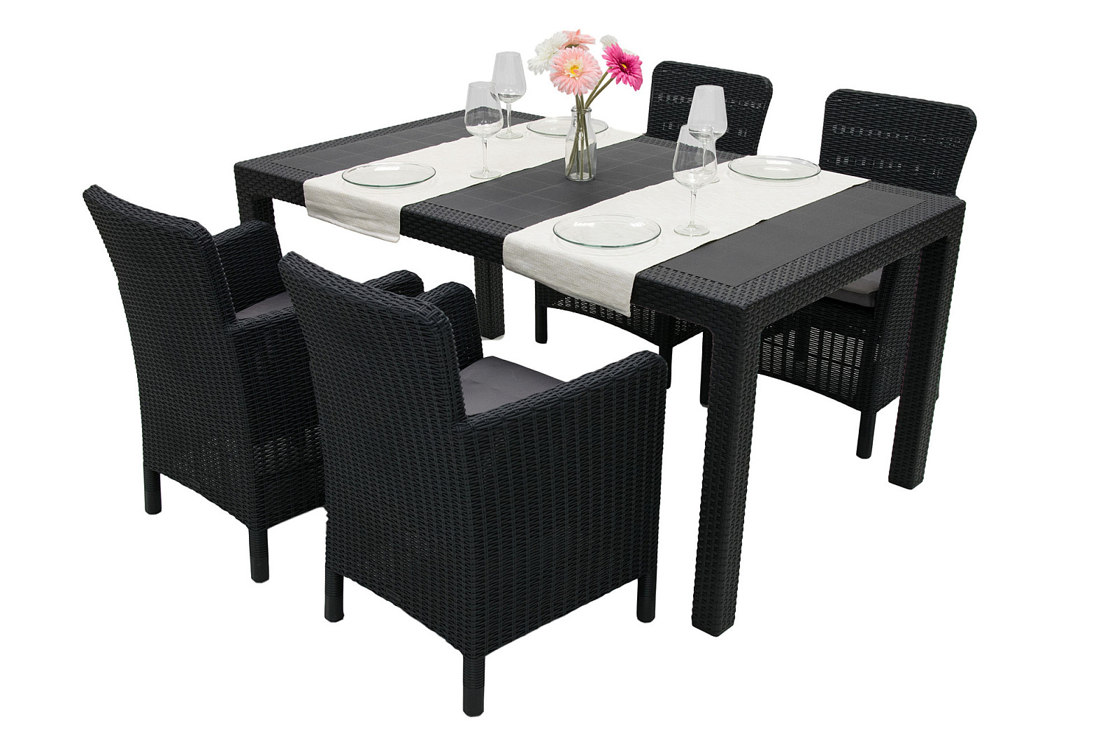 Sestava obsahuje: 4x Záhradné kreslo z umelého ratanu DANTE DINNING (antracit), 1x Záhradný stôl z umelého ratanu MANHATTAN 161 x 95 cm (antracit)
