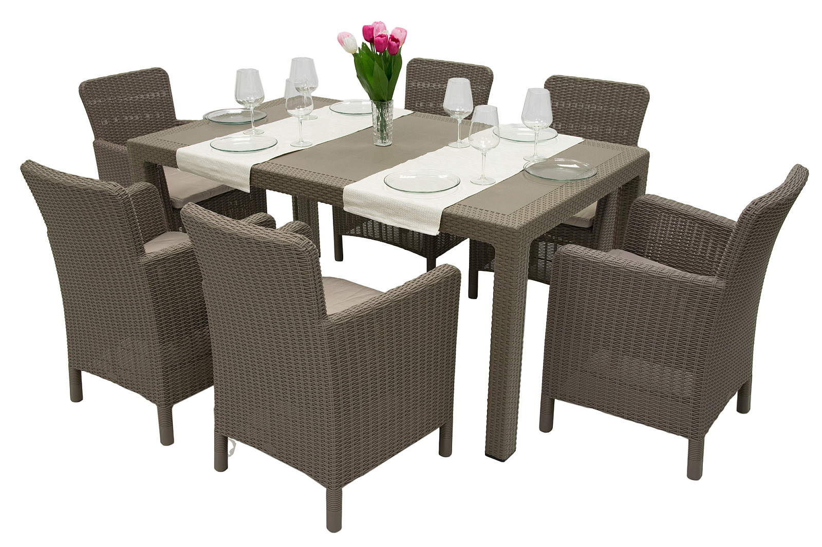 Sestava obsahuje: 6x Záhradné kreslo z umelého ratanu DANTE DINNING (cappuccino), 1x Záhradný stôl z umelého ratanu MANHATTAN 161×95 cm (cappuccino)