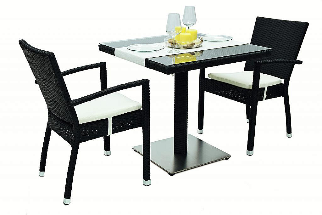 Jednoduchá údržba, elegantný vzhľad. Sestava obsahuje: 1x Záhradný ratanový stôl GINA 80×80 cm (čierna), 2x Záhradné ratanové kreslo NAPOLI s poduškou (čierna)