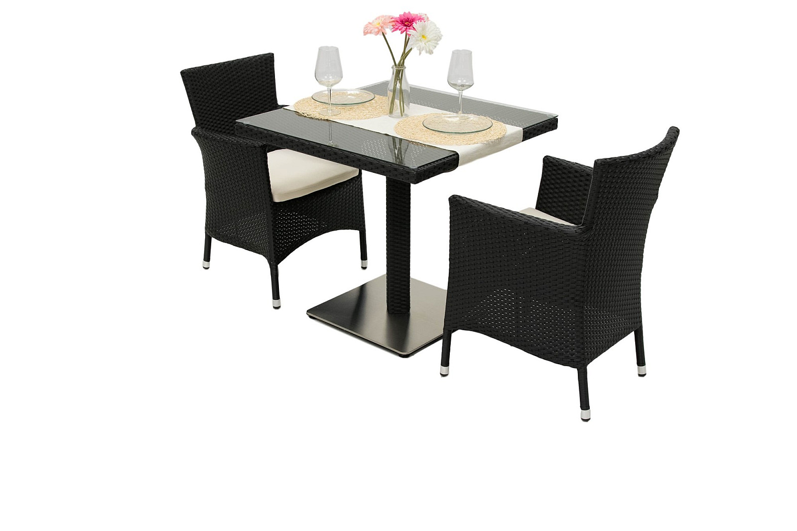 Výhodou je možnosť stohovania kresiel, ktoré je zabezpečené pomocou dvoch otvorov na nohy, ktoré sú šikovne maskované poduškou. Sestava obsahuje: 2x Ratanové kreslo stohovateľné MODENA s poduškou (čierna), 1x Záhradný ratanový stôl GINA 80×80 cm (čierna)