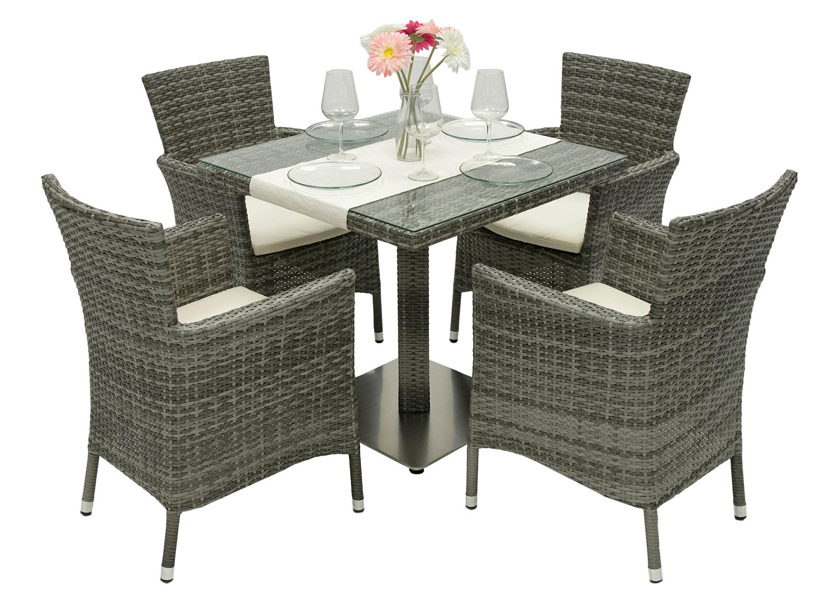 Výhodou je možnosť stohovania kresiel, ktoré je zabezpečené pomocou dvoch otvorov na nohy, ktoré sú šikovne maskované poduškou. Sestava obsahuje: 4x Ratanové kreslo stohovateľné MODENA s poduškou (sivá), 1x Záhradný ratanový stôl GINA 80×80 cm (sivá)
