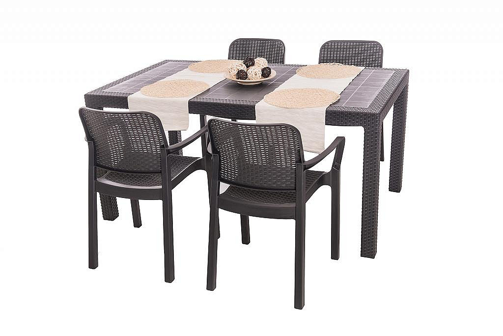 Konštrukcia odolává výkyvom počasia, poveternostným podmienkam, vode i UV žiareniu Sestava obsahuje: 4x Záhradná plastová stolička KARA (antracit), 1x Záhradný stôl z umelého ratanu MANHATTAN 161 x 95 cm (antracit)