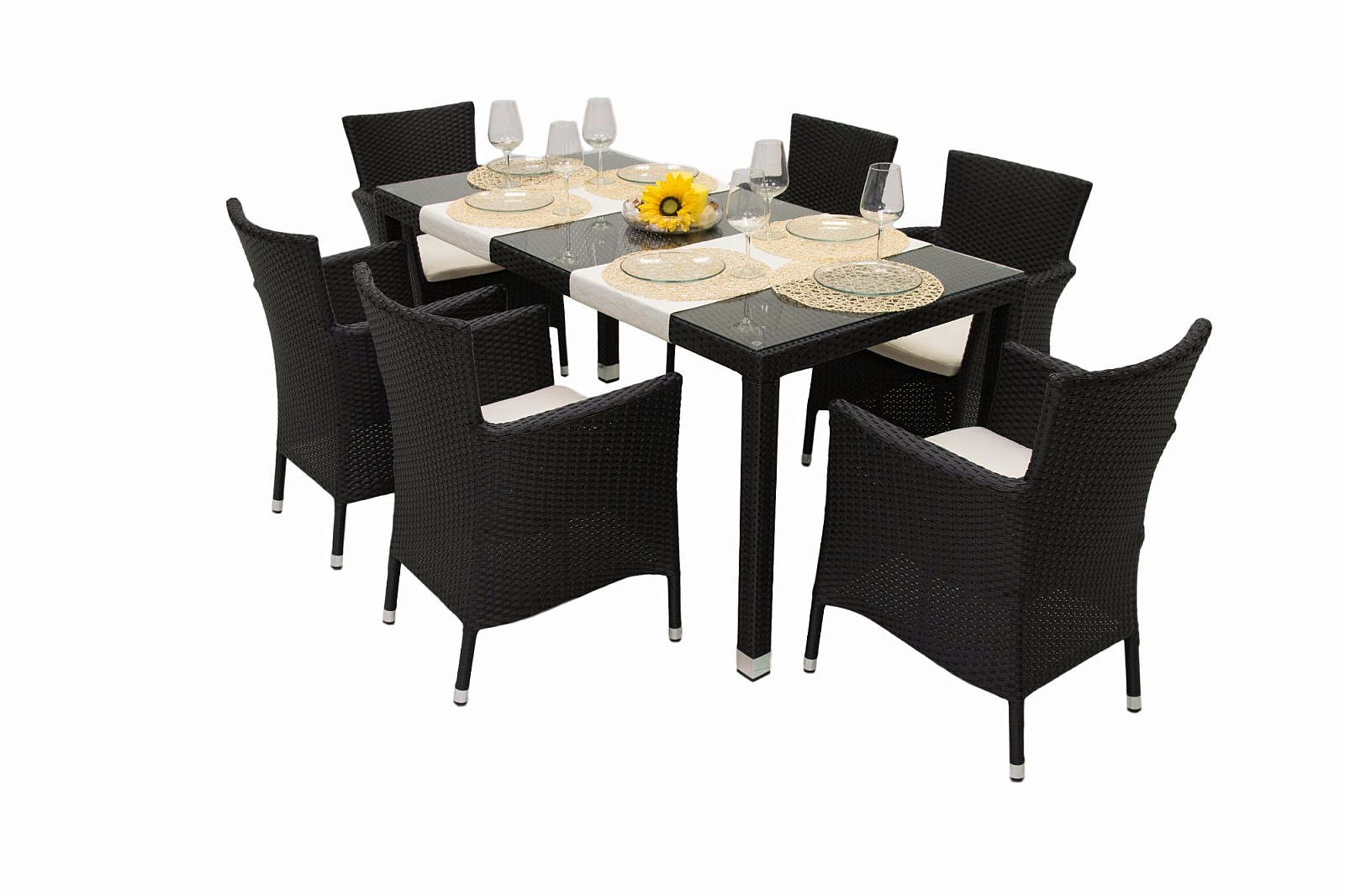 Výhodou je možnosť stohovania kresiel, ktoré je zabezpečené pomocou dvoch otvorov na nohy, ktoré sú šikovne maskované poduškou. Sestava obsahuje: 1x Záhradný ratanový stôl NAPOLI 160×80 cm (čierna), 6x Ratanové kreslo stohovateľné MODENA s poduškou (čierna)