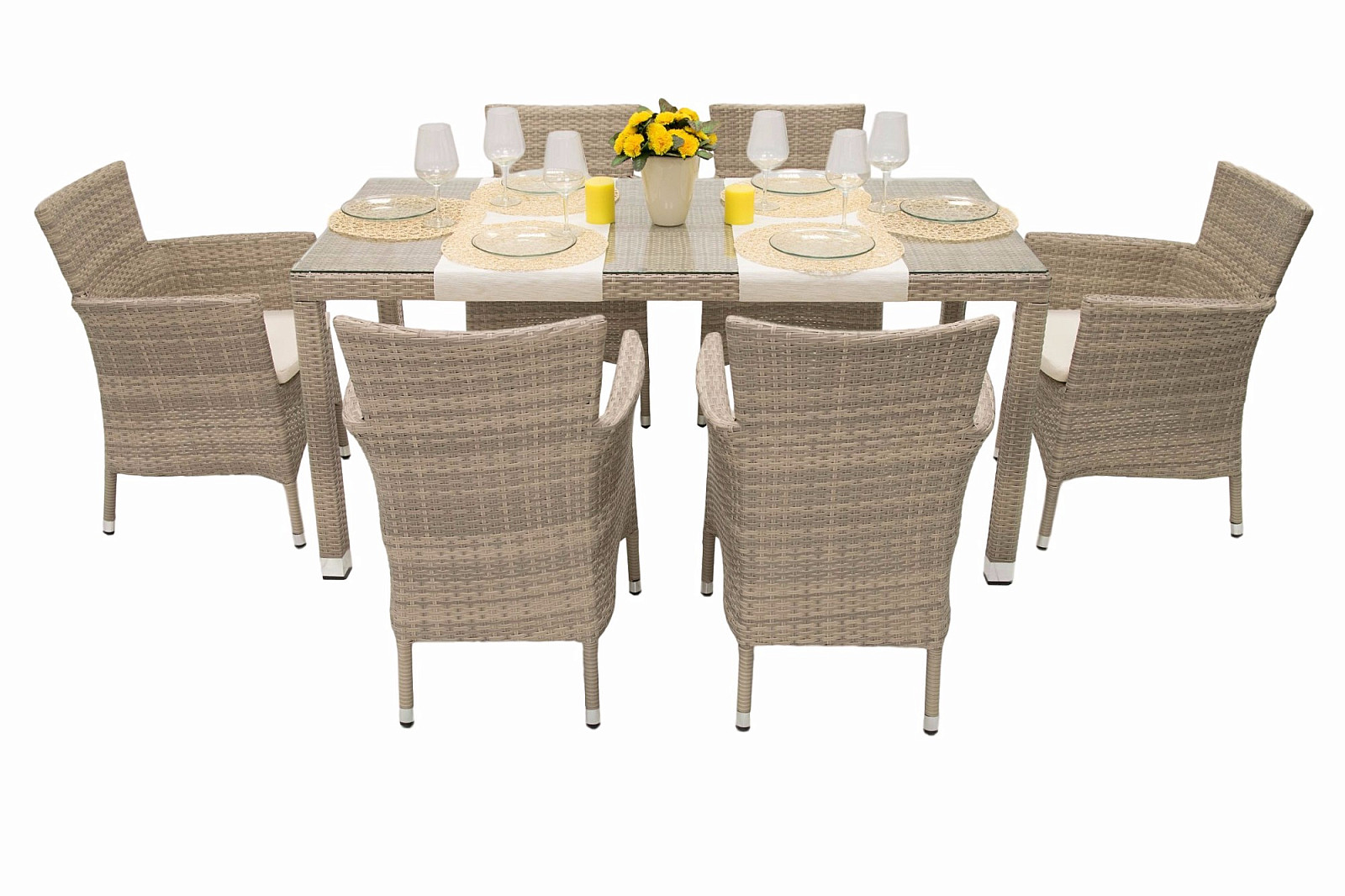 Výhodou je možnosť stohovania kresiel, ktoré je zabezpečené pomocou dvoch otvorov na nohy, ktoré sú šikovne maskované poduškou. Sestava obsahuje: 1x Záhradný ratanový stôl NAPOLI 160×80 cm (sivo-béžová), 6x Ratanové kreslo stohovateľné MODENA s poduškou (sivo-béžová)