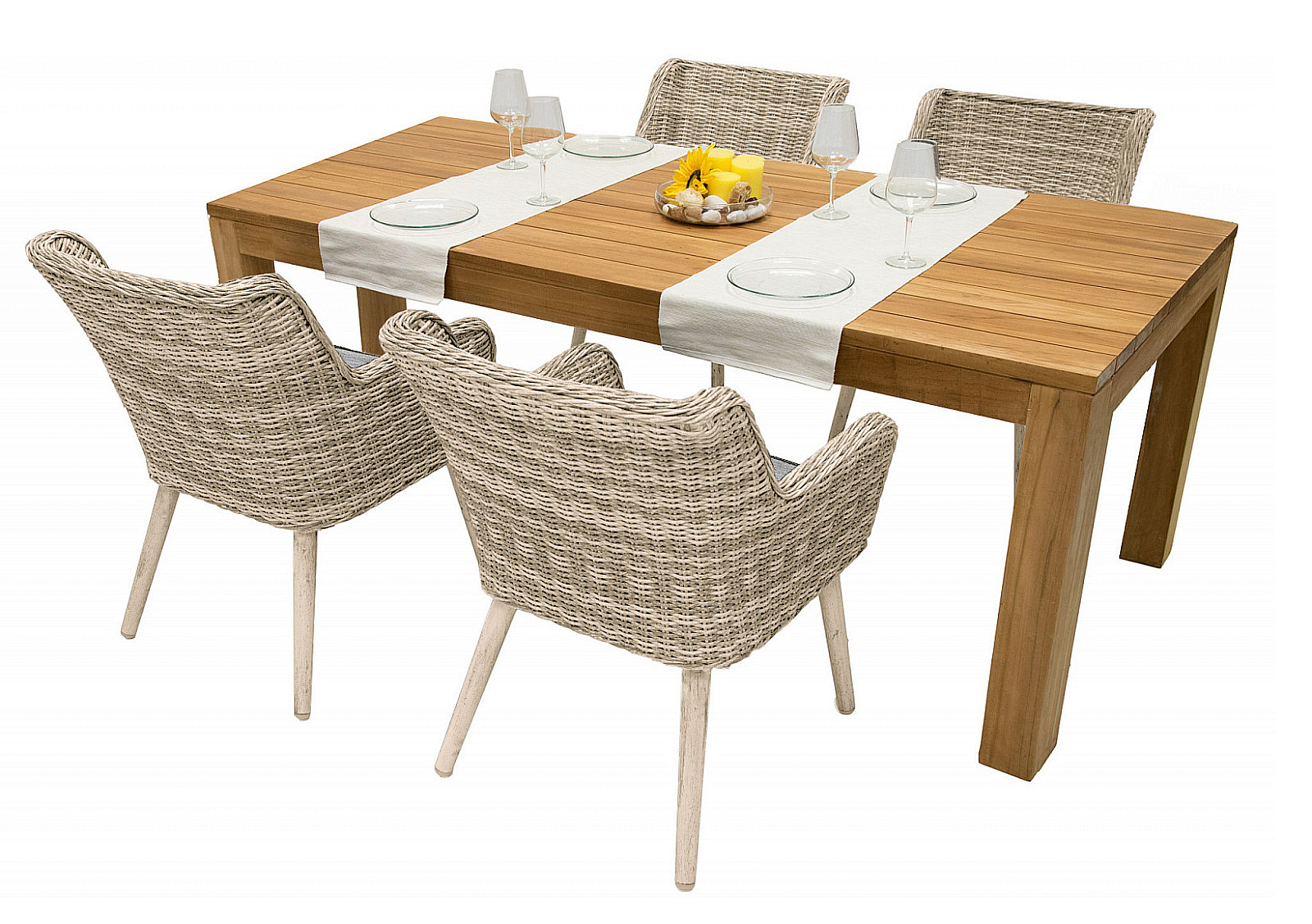 Set Monte Victoria obsahuje masívny teakový stôl stôl (240×200 cm) a štyri kreslá z umelého ratanu . Kreslá majú vďaka stabilnej konštrukcii vysokú nosnosť (120 kg), takže sa na ne môžete stopercentne spoľahnúť. Súčasťou zostavy je aj set podušiek pre pohodlné sedenie. Polstre majú snímateľné poťahy, ktoré je možné vyprať, takže údržba je veľmi jednoduchá.