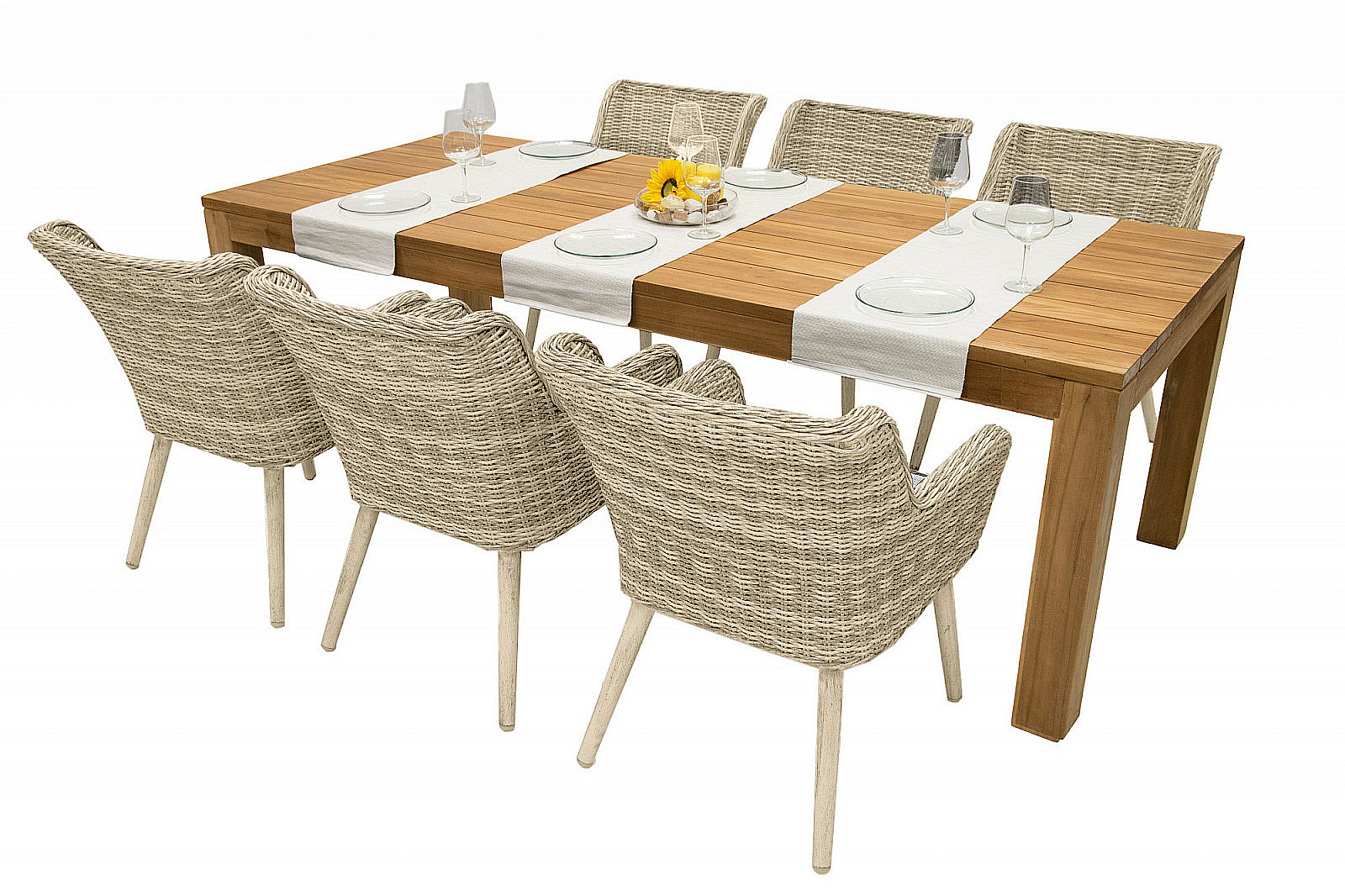 Set Monte Victoria obsahuje masívny teakový stôl stôl (240×200 cm) a šesť kresiel z umelého ratanu . Kreslá majú vďaka stabilnej konštrukcii vysokú nosnosť (120 kg), takže sa na ne môžete stopercentne spoľahnúť. Súčasťou zostavy je aj set podušiek pre pohodlné sedenie. Polstre majú snímateľné poťahy, ktoré je možné vyprať, takže údržba je veľmi jednoduchá.