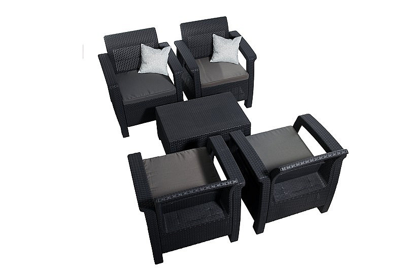 Dodávané v rozloženom stave Sestava obsahuje: 1x Záhradná ratanová zostava CORFU DUO (antracit), 1x Záhradná ratanová zostava CORFU WEEKEND antracit