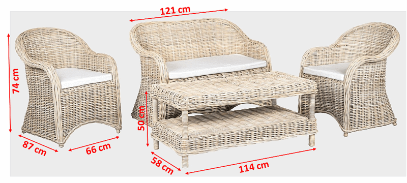 Ratan cubu sa vyznačuje vysokou pevnosťou a odolnosťou. Na dotyk pôsobí veľmi príjemne. Súčasťou je aj kvalitné pohodlné polstrovanie. Materiál: prírodný ratan, Výška celkom: 740, Obsahuje: 2x kreslo, sofa, stolík, Rozmer stola: 1140 x 580 x 500, Rozmer kreslá / stoličky: 660 x 740 x 870, Rozmer 2-miestne lavice / pohovky: 1210 x 740 x 870, Polstrovanie: áno
