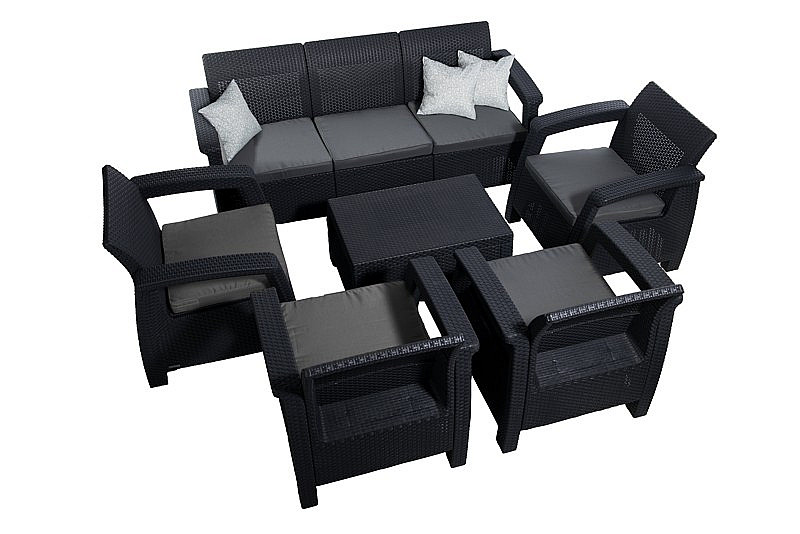 Dodávané v rozloženom stave Sestava obsahuje: 1x Záhradná ratanová pohovka CORFU LOVE SEAT MAX (antracit), 1x Záhradná ratanová zostava CORFU DUO (antracit), 1x Záhradná ratanová zostava CORFU WEEKEND antracit