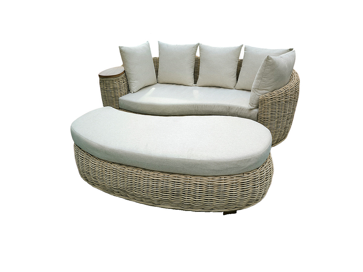 Záhradná ratanová zostava VALI z prírodného brúseného ratanu CUBU. Brúsený ratan je ponechaný v prírodnom stave. Set sa skladá z podnožníka (165x75x48cm) a sófa (210x100x78 cm). Ratan cubu sa vyznačuje vysokou pevnosťou a odolnosťou. Na dotyk pôsobí veľmi príjemne. Súčasťou je kvalitné pohodlné polstrovanie. Pri spojení oboch časí vznikne veľmi pohodlné lôžko Podnožné možno používať aj ako ďalší priestor na sedenie, v tomto prípade dopručujeme doplniť zostavu stolíkom z našej ponuky.