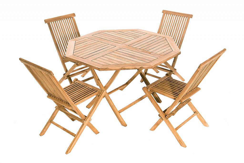 Použitie: interiér, exteriér Sestava obsahuje: 4x Záhradná skladacia stolička s poduškou FOXI (teak), 1x Záhradný skládací stôl osemuholník HAGEN ⌀ 120 cm (teak)
