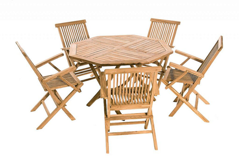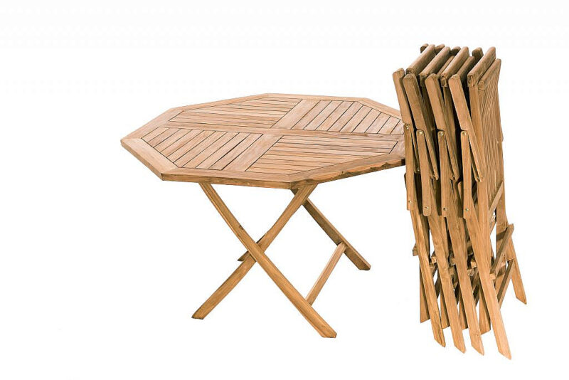 Použitie: interiér, exteriér Sestava obsahuje: 5x Záhradná skladacia kreslo s poduškou IVORY (teak), 1x Záhradný skládací stôl osemuholník HAGEN ⌀ 120 cm (teak)