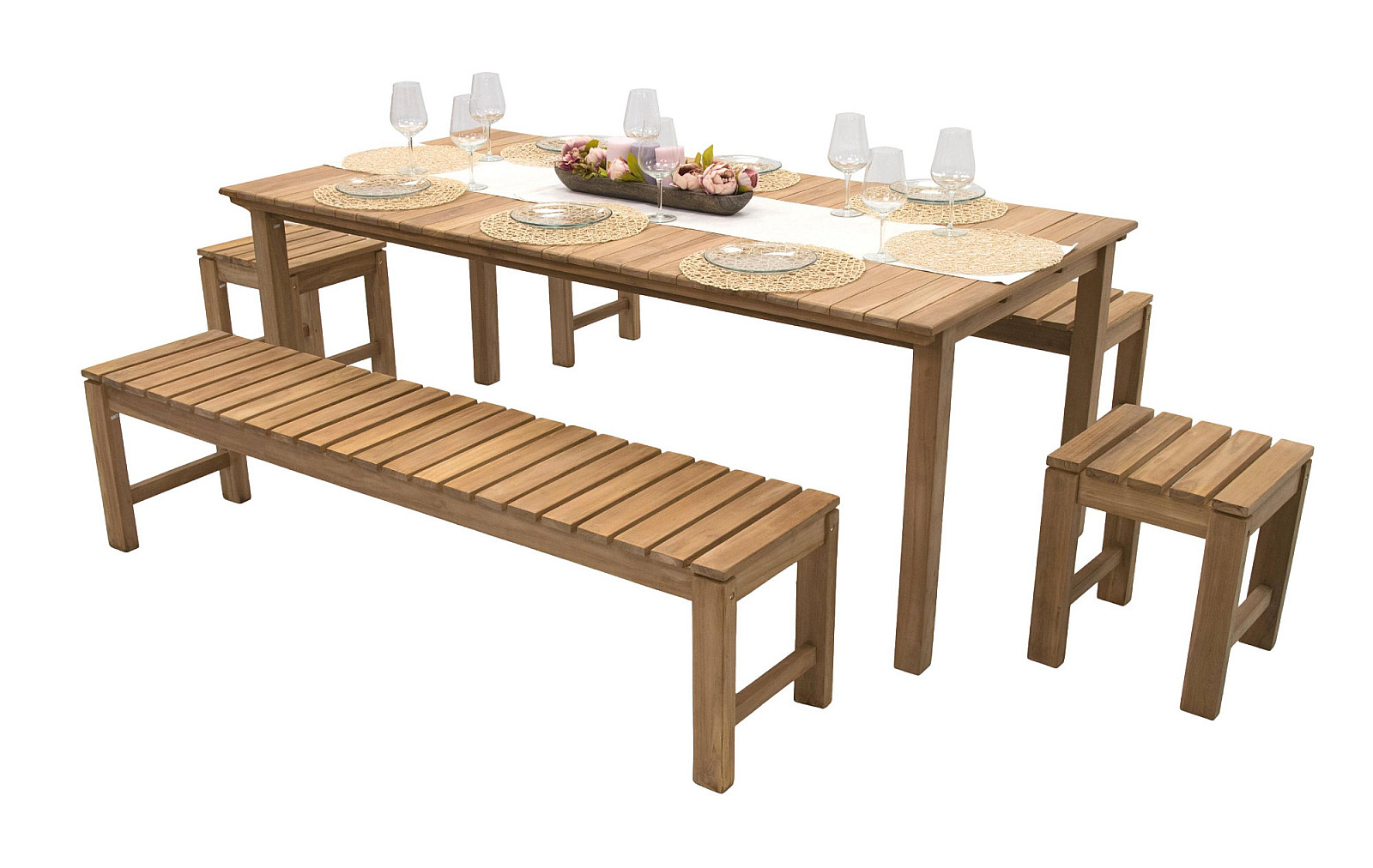 Aj napriek tomu sa jedná o odolný prírodný materiál, odporúčame nábytok raz ročne impregnovať teakovým olejom (viď príslušenstvo). Sestava obsahuje: 1x Záhradný pevný stôl obdĺžnik JOHNSON 200×100 cm (teak), 2x Záhradná teaková lavica JOHNSON 180 cm, 2x Záhradná stolička/taburet JOHNSON (teak)