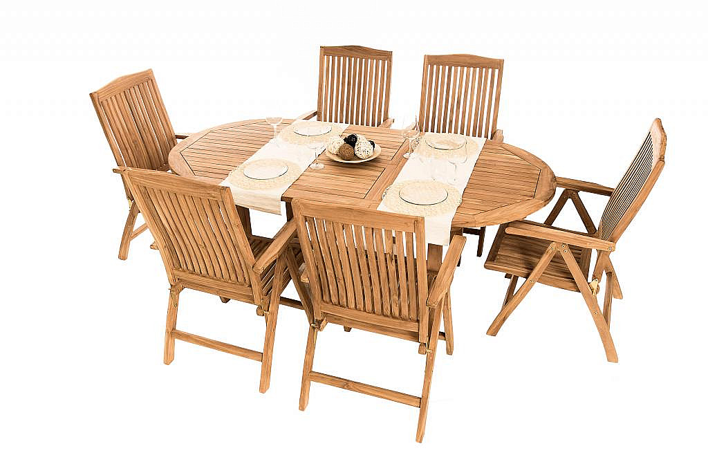Použitie: interiér, exteriér Sestava obsahuje: 1x Záhradný oválný stôl SANTIAGO 160/210 x 100 cm (teak), 6x Záhradné teakové polohovacie kreslo LAGUNA (teak)