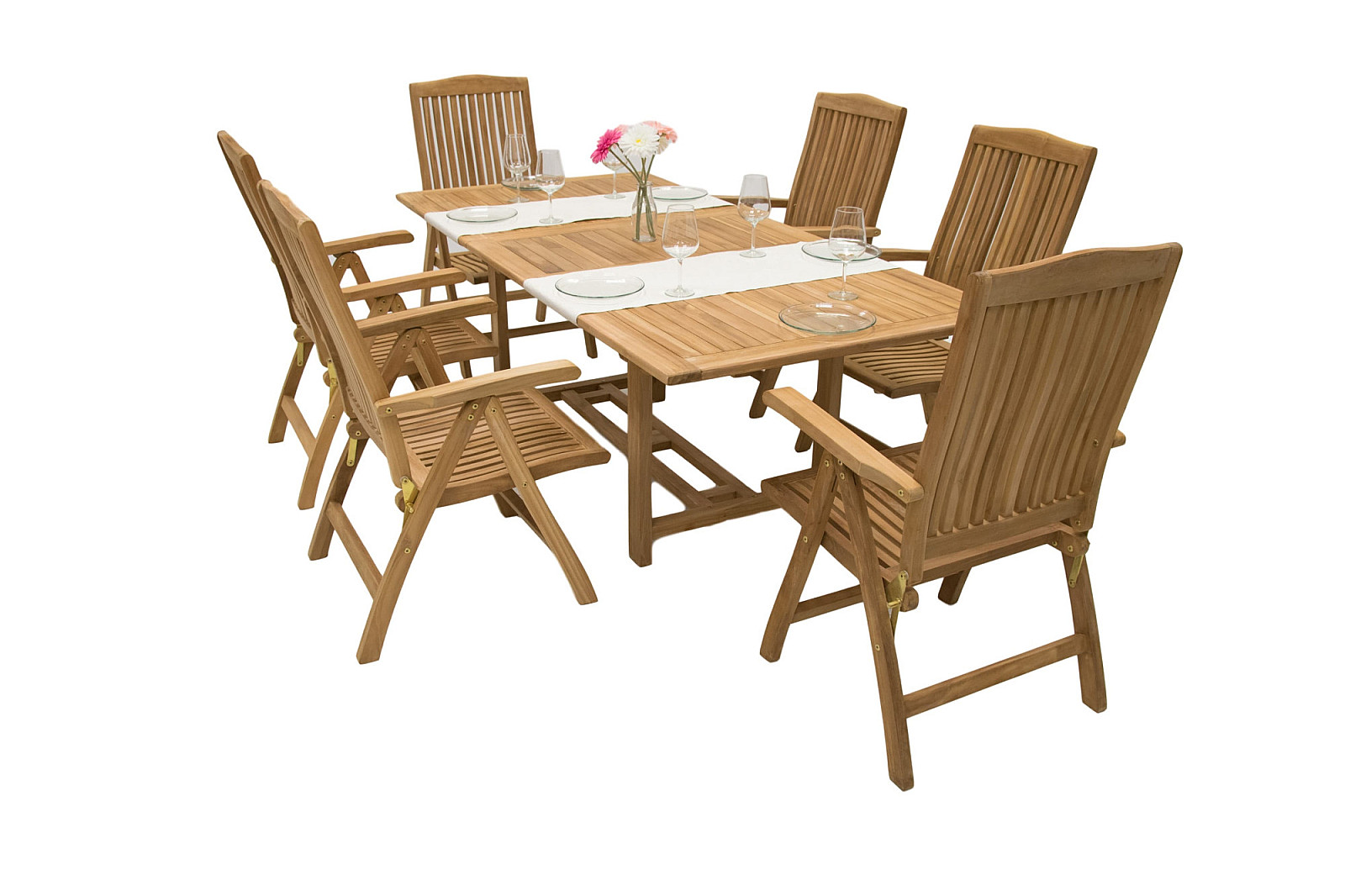 Použitie: interiér, exteriér Sestava obsahuje: 1x Záhradný obdĺžnikový stôl MONTANA 160/210 x 90 cm (teak), 6x Záhradné teakové polohovacie kreslo LAGUNA (teak)