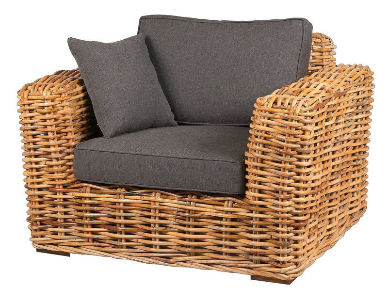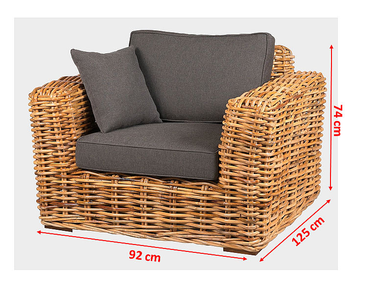 Kreslo 125x92x74cm z prírodného silného ratanu mandola. Konštrukcia je vyrobená z pevnostného 30 mm ratanu. Čalúnenie je vyrobené z veľmi kvalitnej vodeodolnej poťahovej látky SUN UMBRELLA. Ratan je odolný voči poveternostným podmienkam aj mrazu. Na priamom slnku a daždi dochádza k šednutiu nábytku. Výška celkom: 740, Šírka celkom: 920, Hĺbka celkom: 120, Materiál: prírodný ratan, Stohovateľnosť: nie, Polohovateľnosť: nie, Možnosť zloženia: nie, Poduška: áno