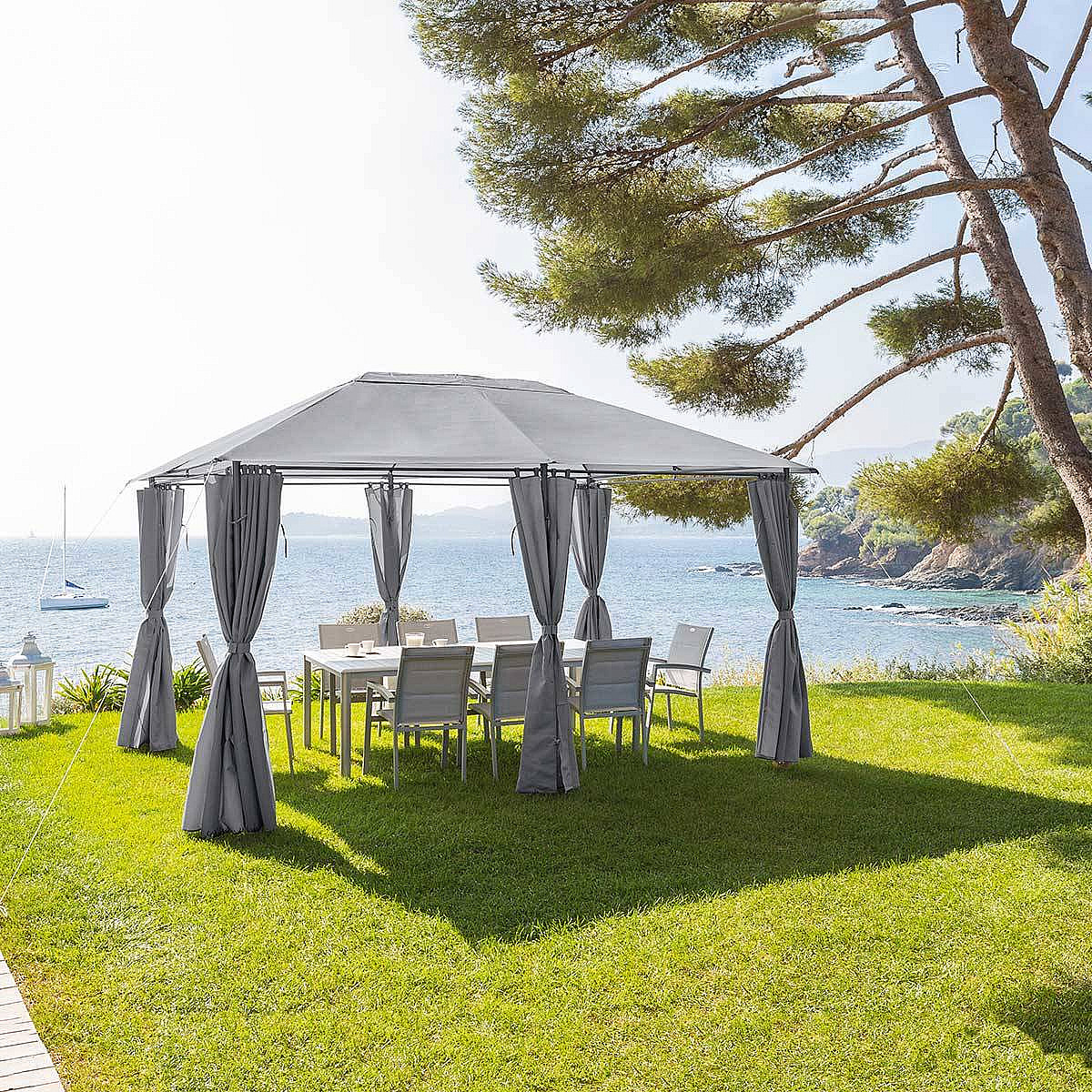 Nadčasové línie altánku sa budú hodiť ku každému typu záhradného nábytku. Obsahuje 6 závesov, ktoré vytvoria intímny priestor alebo Vás ochránia pred ľahkým vetrom. Polyesterová látka má UV faktor 50 a taktiež odoláva vyblednutiu.
