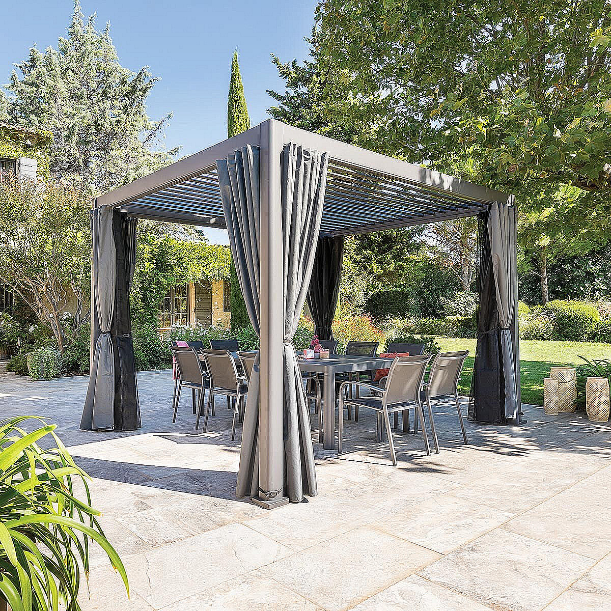 Pergola je vybavená lamelovou strechou, ktorú je možné otáčať kľukou a prepúšťať alebo filtrovať svetlo. Ideálne riešenie pre tých, ktorí chcú veľký priestor na vonkajšie posedenie.