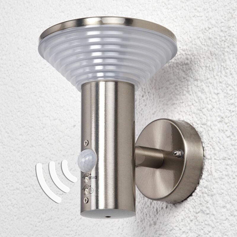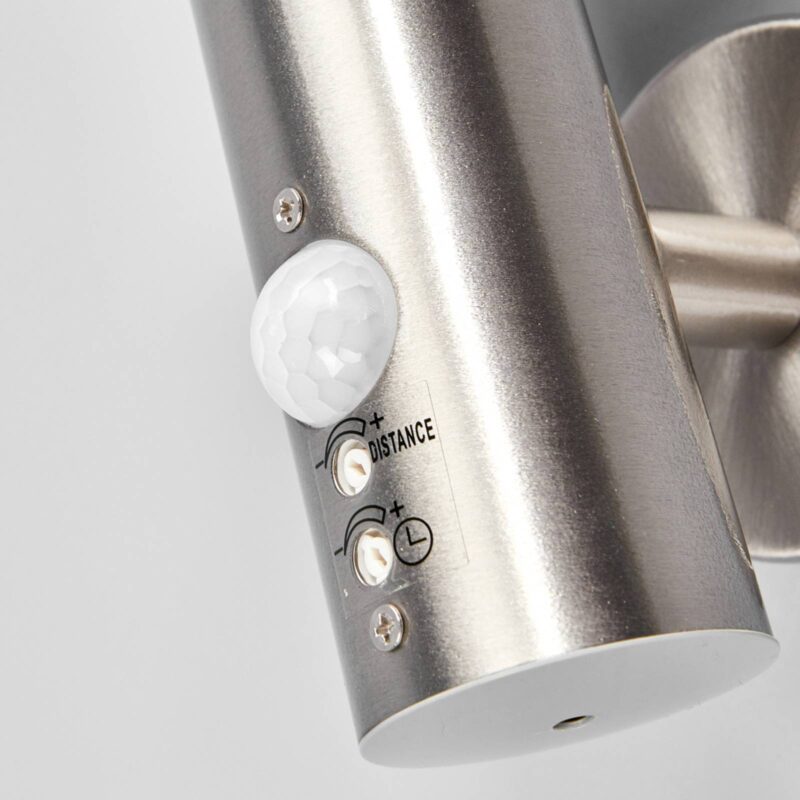Atraktívne nástenné svietidlo Tiga z nehrdzavejúcej ocele s pohybovým senzorom Svietidlo Tiga je určené do exteriéru, kde vďaka svojmu pohybovému senzoru predstavuje komfortný zdroj svetla. V prípade, že senzor zaregistruje pohyb, LED diódy, ktoré sú energeticky úsporné, pričom sa starajú aj o žiarivé svetlo, sa okamžite zapnú. Uhol dosahu činí 90 stupňov, zatiaľ čo dĺžku svietenia (5 sekúnd až 6 minút) a vzdialenosť, v ktorej senzor rozpozná osobu (2 až 6 metrov) možno individuálne nastavovať.