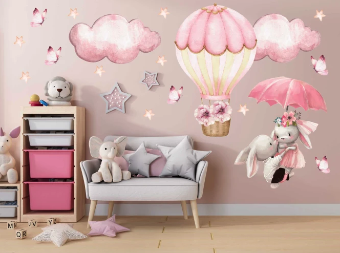 Premeňte izbu svojej malej princeznej na jemnú rozprávkovú krajinu s týmito nádhernými detskými nálepkami na stenu s pastelovými králičkami, balónmi a motýľmi. Sú navrhnuté špeciálne pre dievčatká, ktoré milujú nežné farby, zvieratká a čarovnú atmosféru plnú fantázie.
