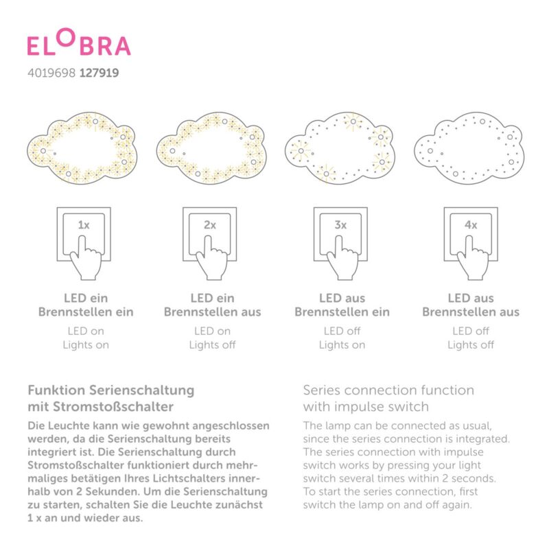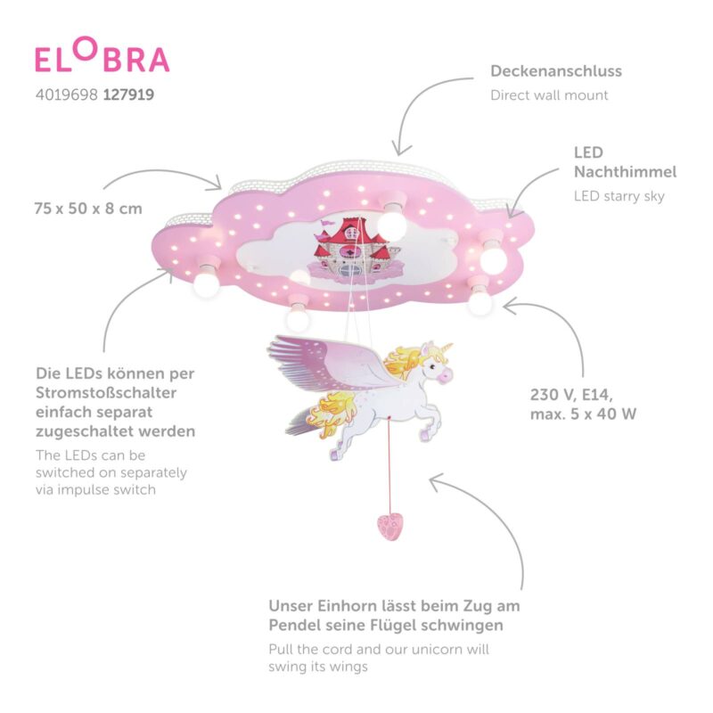 Rozprávkové stropné svietidlo Zámok s jednorožcom a funkciou nočného svetla Toto je miesto, kde sa plnia sny dievčat: impozantné stropné svietidlo je vyrobené vo forme oblaku. Motív v strede ukazuje zámok snov v oblakoch a 40 malých diód LED je zoradených pozdĺž okraja. Tieto teplé biele diódy LED sa môžu jednotlivo zapnúť ako nočné svetlo. Plné osvetlenie detskej izby zabezpečuje päť žiaroviek, ktoré nie sú súčasťou dodávky. Prepínanie medzi dvoma možnosťami osvetlenia, ako aj spoločné spínanie všetkých žiaroviek sa dá ľahko dosiahnuť pomocou nástenného spínača. Ako hravý prvok k stropnému svietidlu Zámok je umiestnený jednorožec. Svietidlo je vyrobené výlučne z dreva, navrhnuté tak, aby vyhovovalo deťom a stimuluje predstavivosť každého dievčatka.