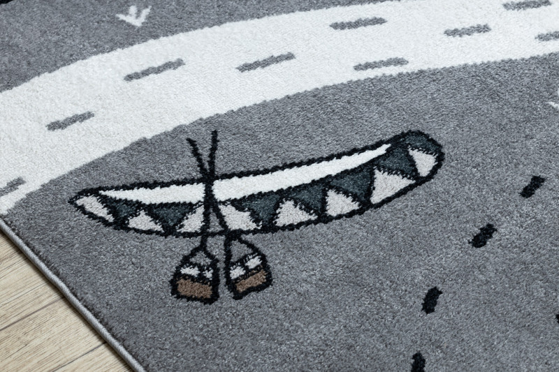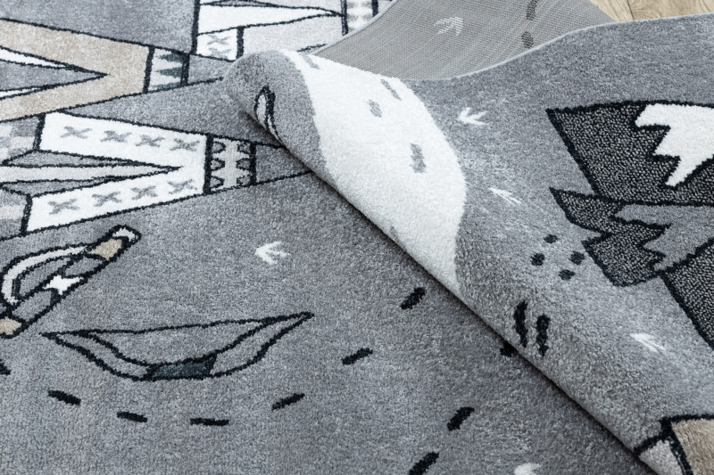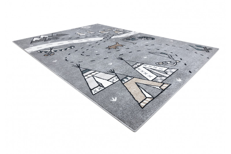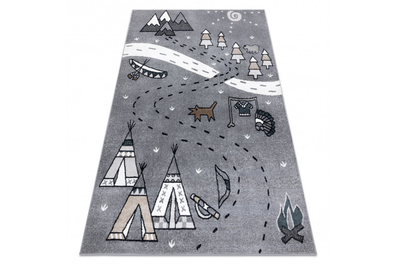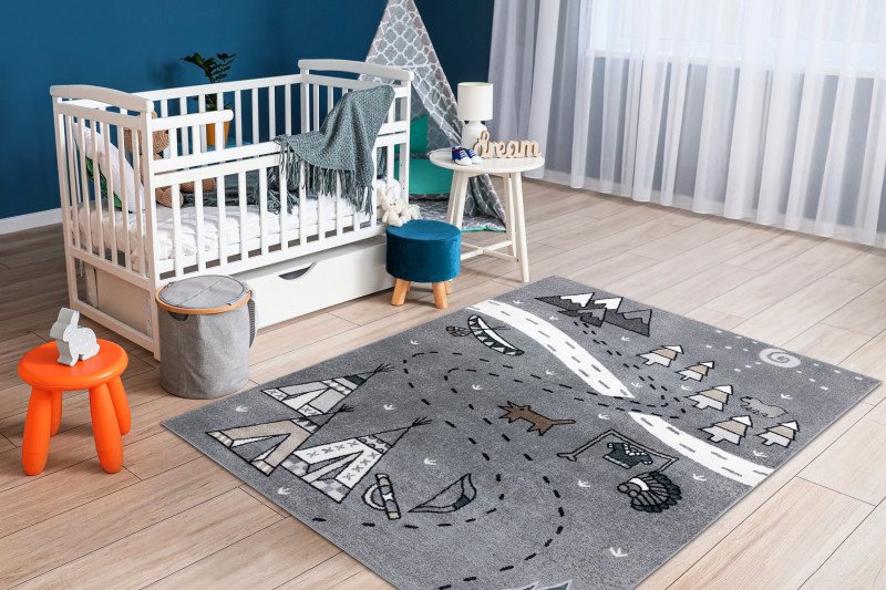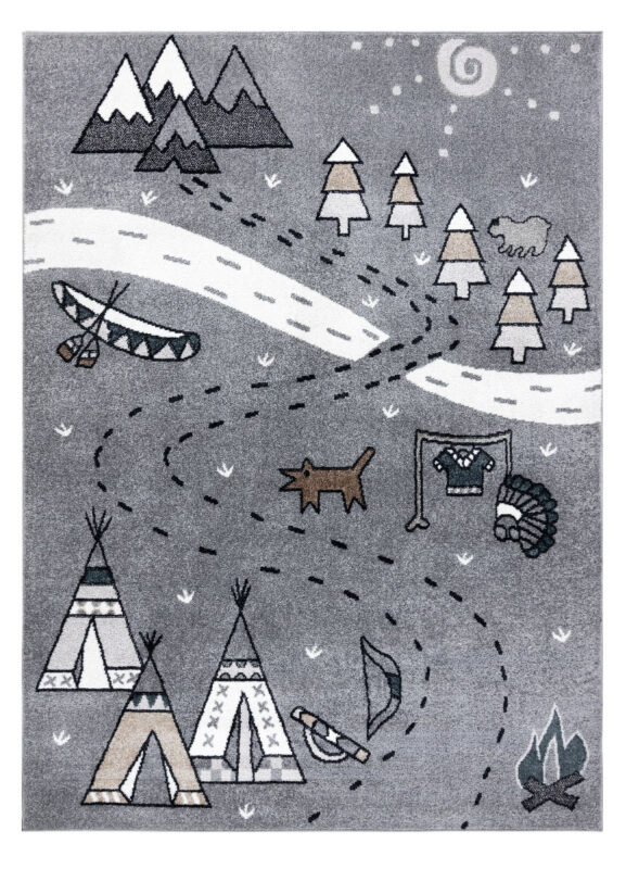 Detský kusový koberec Fun Teepee grey navodí indiánske prostredie. Koberec zobrazuje indiánsku dedinu s prvkami ich života, voda, kanoe, náčelnícka čelenka, lúk, teepee, les a hory. Deti si tento koberec obľúbia na rôzne hry a trávenie času vďaka mäkkému a veľmi jemnému strihanému vlasu zo 100% polypropylénu. Tento typ materiálu tiež má výbornú teplotnú izoláciu, nemusíte sa už báť chladu z podlahy. Na výrobu nebola použitá žiadna toxická látka a tým výrobok je veľmi vhodný aj pre alergické deti.