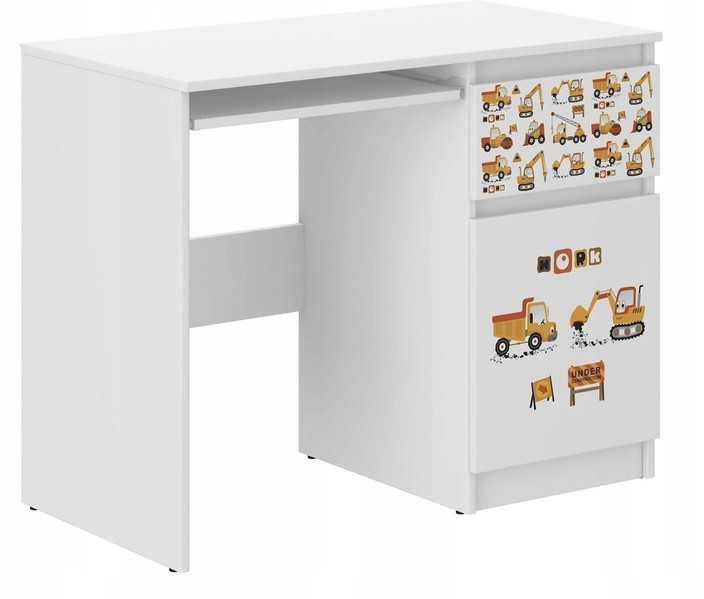Písací stôl je vyrobený z bielej drevotriesky, povrchovo upravený dyhou. Má jednu funkčnú zásuvku a skrinku s dvomi policami. Predná strana písacieho stola má farebnú potlač, ktorá má pekné živé farby a je zabezpečená špeciálnym laminátom proti vyblednutiu či odretiu. Môžete ho vyčistiť vlhkou handričkou.