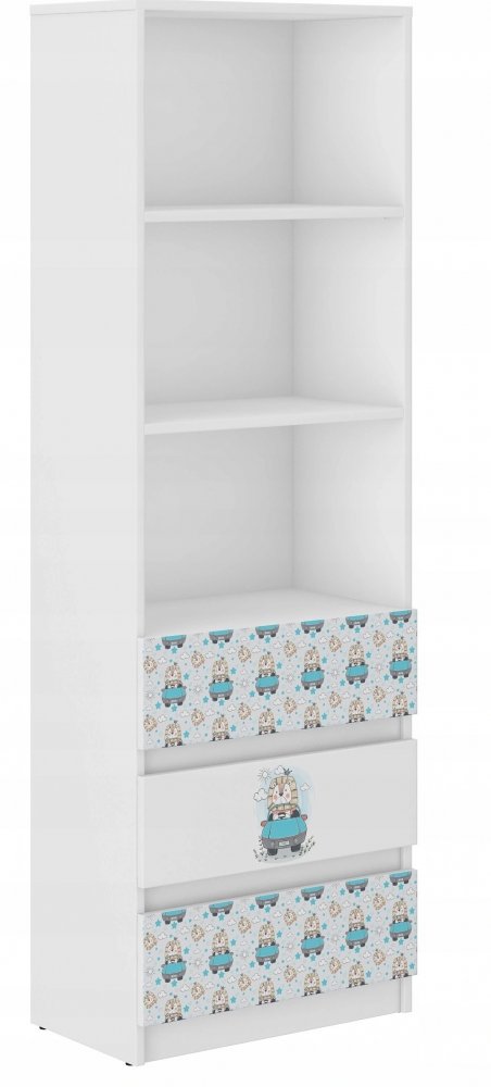 Regál alebo knižnica je vyrobená z bielej drevotriesky, povrchovo upravená dyhou. V spodnej časti regálu sú tri uzavreté zásuvky, v hornej časti sú dve police. Dvierka zásuviek majú farebnú potlač s krásnymi, živými farbami, ktoré sú zabezpečené špeciálnym laminátom, aby nevybledli a neopotrebovali sa. Hrany regálu sú zabezpečené kvalitným PVC materiálom s vysokou mechanickou a chemickou odolnosťou. Regál je možné jednoducho vyčistiť a to navhlčenou handričkou.