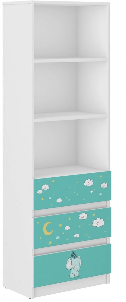 Regál alebo knižnica je vyrobená z bielej drevotriesky, povrchovo upravená dyhou. V spodnej časti regálu sú tri uzavreté zásuvky, v hornej časti sú dve police. Dvierka zásuviek majú farebnú potlač s krásnymi, živými farbami, ktoré sú zabezpečené špeciálnym laminátom, aby nevybledli a neopotrebovali sa. Hrany regálu sú zabezpečené kvalitným PVC materiálom s vysokou mechanickou a chemickou odolnosťou. Regál je možné jednoducho vyčistiť a to navhlčenou handričkou.