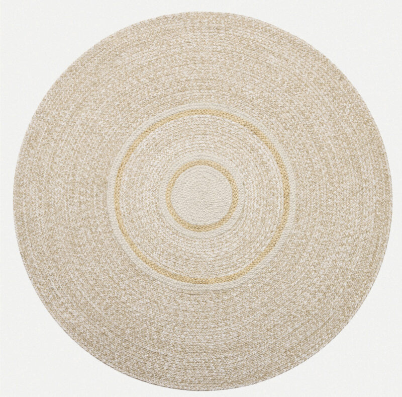Ručne viazaný koberec v prírodnej farbe v kruhovom tvare kombinuje kvalitné spracovanie a estetiku do luxusného celku. Obšité zakončenie zaisťuje trvanlivosť aj eleganciu.