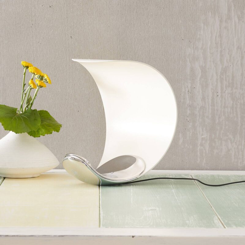 Dizajnová stolová lampa Curl so zrkadlovým reflektorom Už názov stolovej lampy Curl napovedá, na čom je založený jej optický dizajn. Ak sa na dizajnovú stolnú lampu Curl pozriete zboku, uvidíte, že prirovnanie ku kudrlinke nie je až také prehnané, pretože lampa je skutočne krásne stočená. Svetlo je vďaka tomuto tvaru mimoriadne príjemné, pretože ho pozorovateľ vníma ako prevažne nepriame. Vypínač sa nachádza na základni lampy, pomocou ktorého možno dizajnovú stolnú lampu aj stmievať.
