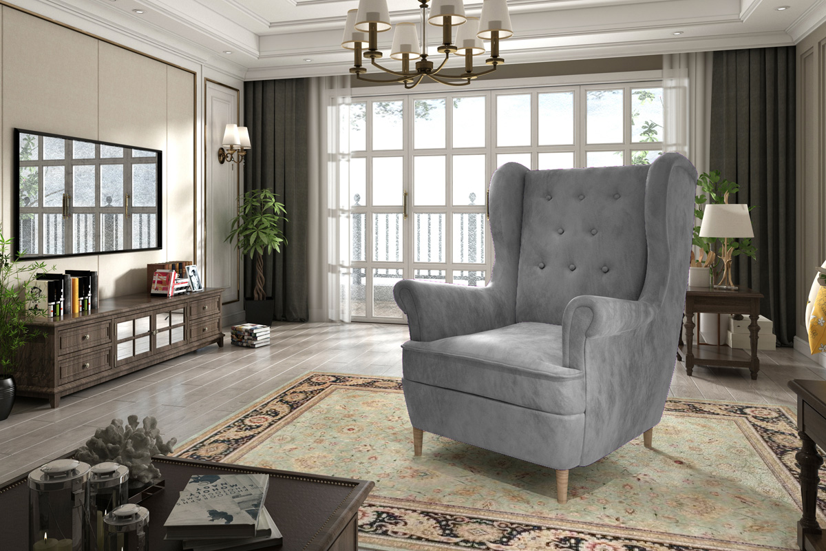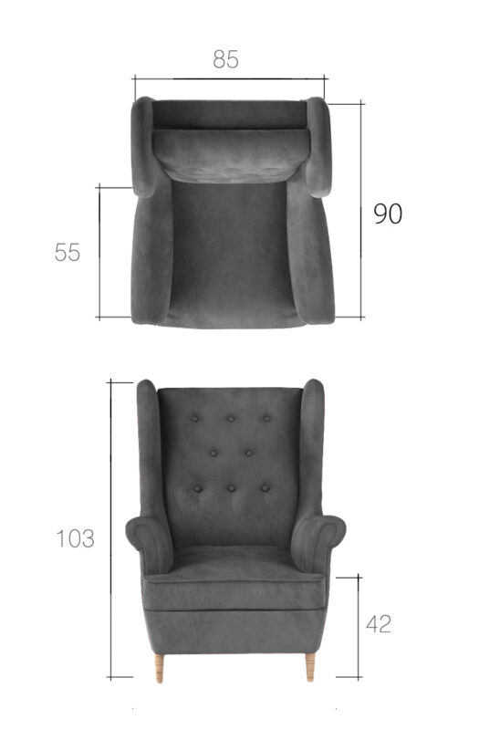 Dizajnové kreslo ANKALIA je v tradičnom prevedení. Je vhodné do moderných aj tradičných interiérov. Kreslo ANKALIA je v štýle ušiak. Stane sa vašim výborným spoločníkom pri leňošení.Kreslo je vyplnené kvalitnými vlnovcovými pružinami spolu s PUR penou. Je celé čalúnené látkou Monolith 84 v šedej farbe.Rozmery kresla (š,v,h): 85 x 103 x 90 cm.Je vynikajúcim doplnkom k pohovkám ANKALIA, ktoré sú v rovnakom dizajne.