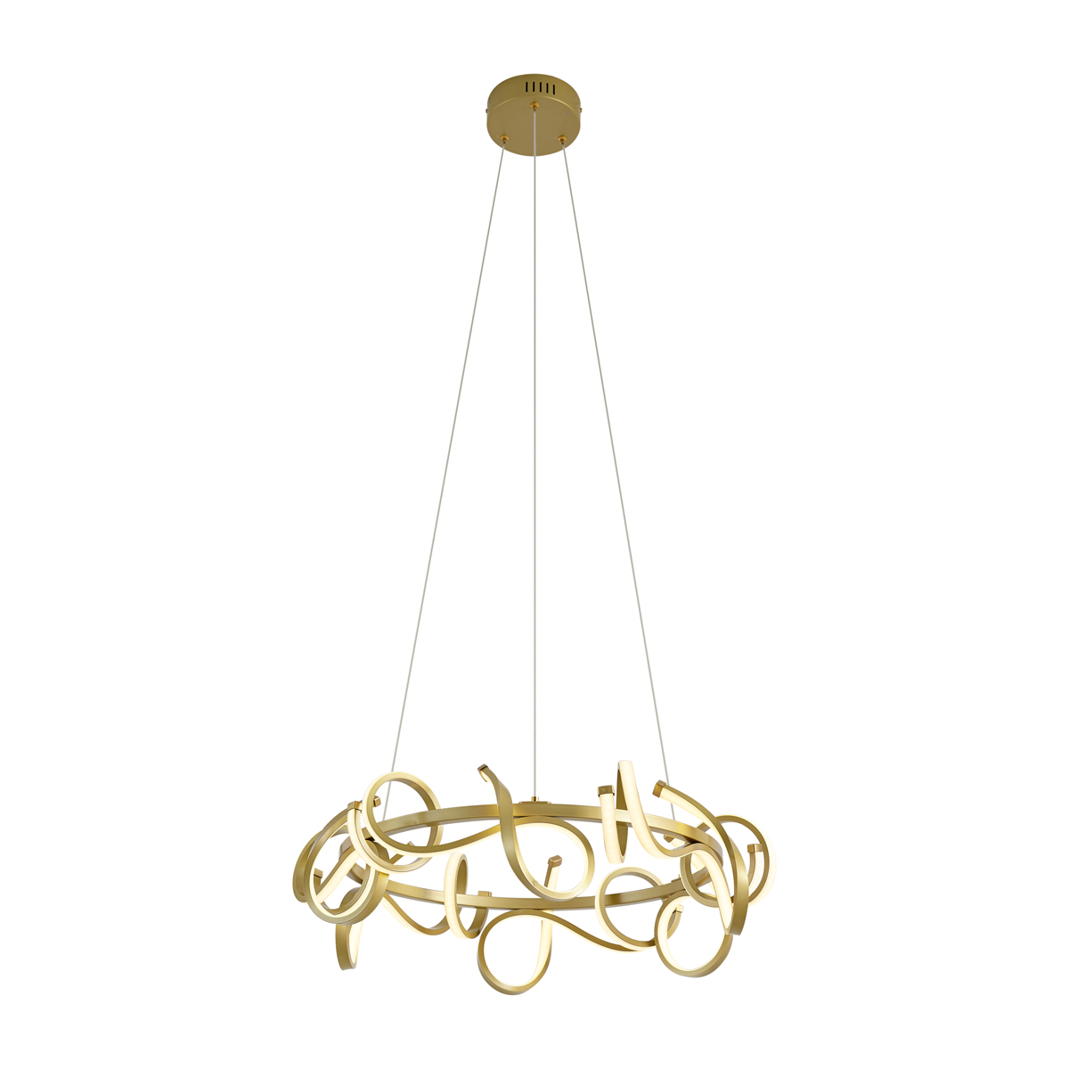 Závesné svietidlo Krisscross v zlatej farbe je štýlový pútač pozornosti, ktorý dokonale kombinuje eleganciu a moderný štýl. Vďaka svojmu okrúhlemu, organickému tvaru a teplému zlatému prevedeniu okamžite vnesie do vášho interiéru luxusnú atmosféru. Táto lampa nie je len pastvou pre oči, ale aj majstrom svetelného zážitku: vďaka integrovanému LED osvetleniu a 3-stupňovej funkcii stmievania si môžete sami určiť intenzitu teplého bieleho svetla (3000K), jednoducho pomocou vlastného nástenného vypínača.