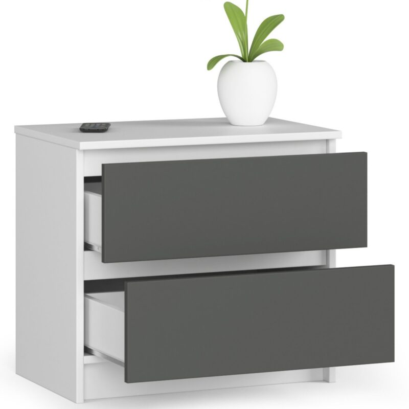 Nočný stolík KARIN60: Kombinácia bielej a grafitu pre modernú spálňu Stolček KARIN60 predstavuje dokonalú zmes funkčnosti a štýlu. Jeho kombinácia čistej bielej a hlbokého grafitu dodáva eleganciu a moderný dizajn, ktorý očarí všetkých, ktorí hľadajú štýl v priestoroch svojej spálne. Typ tovaru: Nočný stolík Vhodné do miestnosti: Spálňa Materiál: LTD Rozmer: 55 x 60 x 40 cm Farba: Biela s grafitovým akcentom Funkcia: Tiché dovieranie Vybavenie: 2 zásuvky Štýl: Moderné, dizajnové KARIN60 je vyrobený z kvalitného materiálu LTD, zaručujúceho odolnosť a dlhú životnosť. Vďaka svojim dvom zásuvkám ponúka dostatok miesta na ukladanie osobných vecí, pričom funkcia tichého dovierania zaisťuje takmer nepočuteľné zatváranie. Moderný a dizajnový vzhľad stolíka je doplnený kontrastnými farbami, ktoré dodajú vašej spálni nádych luxusu a sofistikovanosti.
