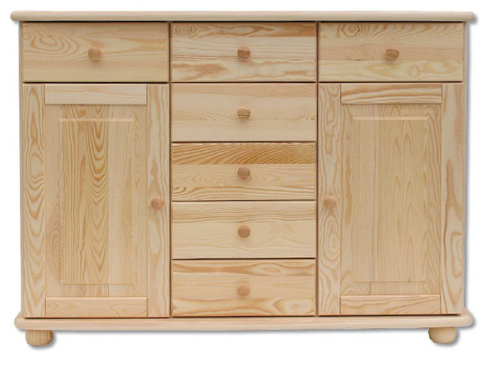 Kombinovaná komoda KD153 – 7 zásuviek, 2 dvierka. Farebné prevedenie – prírodná borovica. Možnosť namorenia na odtieň dub, orech a jelša za príplatok. Nábytok Drewmax je vyrobený z kvalitného borovicového masívu. Pozor!!! Produkt má špeciálnu povrchovú úpravu na ochranu proti škodcom. Preto v prípade ak máte záujem o produkt, ktorý chcete dodatočne namoriť, treba v objednávke uviesť: požadujem produkt bez povrchovej úpravy.