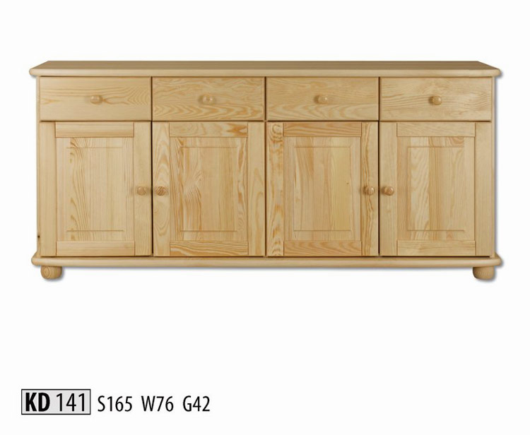 KD141 Kombinovaná komoda z masívneho borovicového dreva. Disponuje 4 zásuvkami. Je štvordverová. Farebné prevedenie: prírodná borovica. Za príplatok je možnosť namorenia na odtieň dub, orech a jelša.
