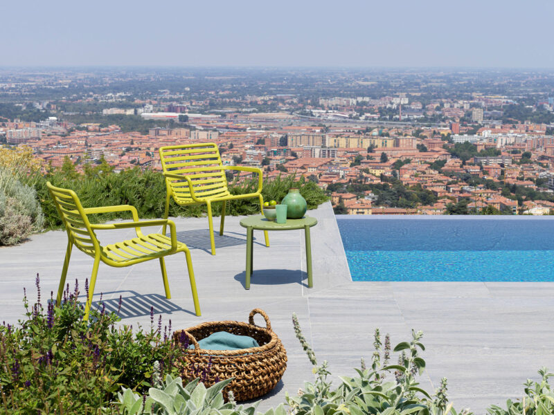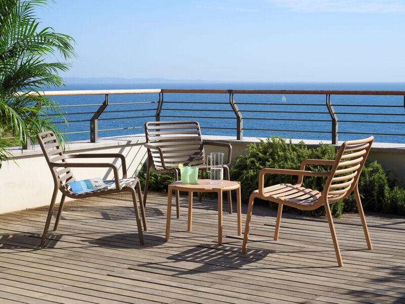 Elegantné záhradné kreslo Doga Relax so štýlovým lamelovým dizajnom v rôznych farbách a variantoch.