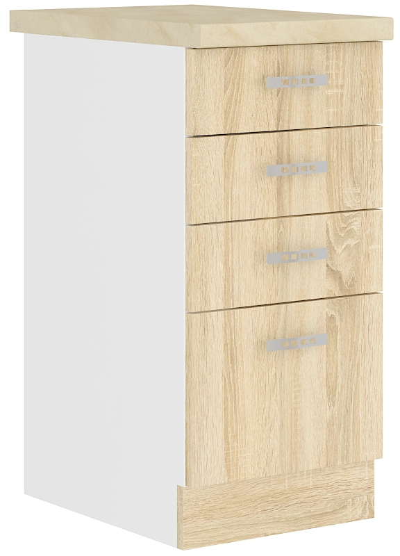 Dolná skrinka SARIA patrí ku komponentom kuchyne SARA, vďaka ktorým si môžete poskladať kuchyňu podľa vašich predstáv. Poteší vás jej výborná cena.Je vyrobená z kvalitných LTD dosiek vo farebnom prevedení DUB SONOMA. Korpus skrinky je v bielej farbe. Pracovná doska nie je súčasťou. Skrinka disponuje štyrmi zásuvkami. Úchyty dvierok sú vyrobené z odolného plastu.Kuchyňa SARA poteší všetkých užívateľov, ktorí majú radi jednoduché a čisté línie a zároveň praktické využitie. Je v modernom a dizajnovom prevedení. Je veľmi priestranná a funkčná. Vďaka veľkému výberu komponentov si poskladáte svoju kuchyňu v menšom aj väčšom priestore.Dodávame v demontovanom stave.
