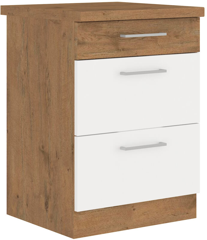 Dolná skrinka VIDO je moderná a elegantná skrinka kuchynského nábytku VIDO. Aj vďaka nej si vytvoríte kuchyňu podľa vašich predstáv.Skrinka disponuje tromi praktickými zásuvkami. Korpus je vyrobený z kvalitných LTD dosiek. Čelo skrinky je z MDF materiálu. Farebné prevedenie je v kontraste dub lancelot a biely lesk. Korpus je vo farbe dub lancelot. Rukoväť je vyrobená z plastu. Pracovná doska nie je súčasťou.Kuchyňa VIDO svojim prevedením poteší všetkých zákazníkov, ktorí majú radi jednoduchosť, praktickosť a zároveň prijateľnú cenu. Je v modernom prevedení s čistými líniami. Je priestranná a funkčná. Vďaka veľkému výberu kuchynského nábytku, ktoré Vido poskytuje, si poskladáte svoju kuchyňu podľa vašich predstáv.Dodávame v demontovanom stave.