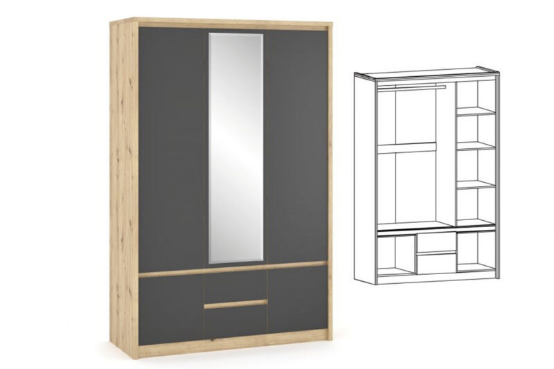 DOMICA šatníková skriňa patrí medzi trojdverové skrine. Zaujímavosťou tohto nábytku je vizuál štruktúry dreva, ktorý je viditeľný na doskách vo farbe artisan. Dvojfarebné prevedenie zvýrazňuje jej vzhľad. Zrkadlo umiestnené na stredových dverách dodá nábytku šmrnc a priestor opticky zväčší.Skriňa ponúka kombinovaný úložný priestor. Časť skrine má priestor na vešanie oblečenia a obsahuje 1 vešiakovú tyč, časť skrine ponúka viacero poličiek. Stredová časť skrine má 2 výsuvné šuplíky. Nábytok je vyrobený z kvalitnej LTD dosky, ktorej nenáročnosť na údržbu ocení každý majiteľ. Systém otvárania je bezúchytový, takže zbytočne nevytŕča do priestoru.Rozmery (š/v/h): Rozmery (š/v/h): 141 x 216,2 x 55,3 cm. Dodávame v demonte.DOMICA šatníková skriňa je jedným z prvkov sektorového nábytku DOMICA. V našej ponuke nájdete aj ďalšie prvky, z ktorých si viete poskladať štýlovú a modernú spálňu.